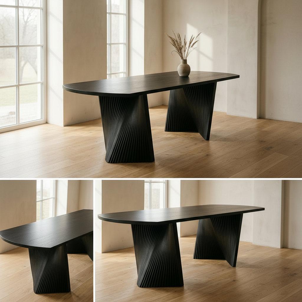 Zdecydowanie stelaż! Długo pracowaliśmy nad taką formą nowoczesnego stołu, aby po pierwsze był piękny i nietypowy, ale i funkcjonalny. Wyjątkowy stelaż, który stanowią dwie nogi, a każda z nich zbudowana jest z kilkudziesięciu dębowych deseczek połączonych ze sobą w taki sposób, aby tworzyły falę.