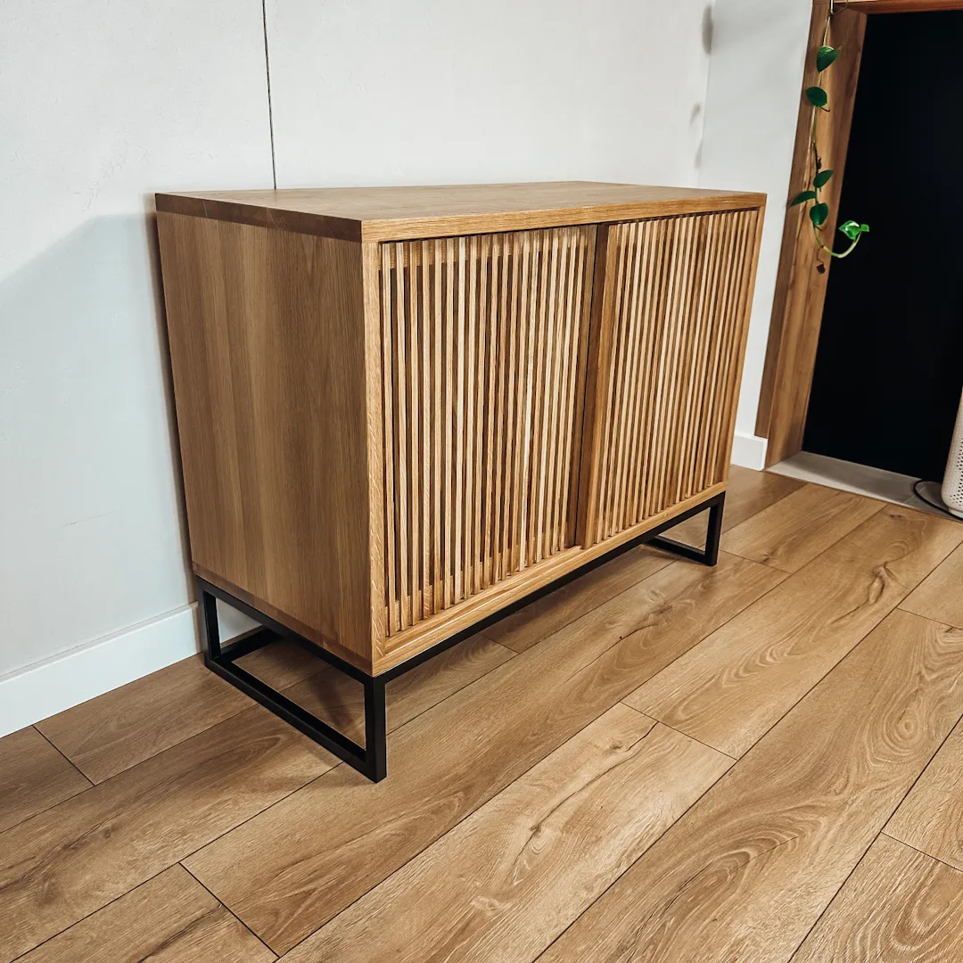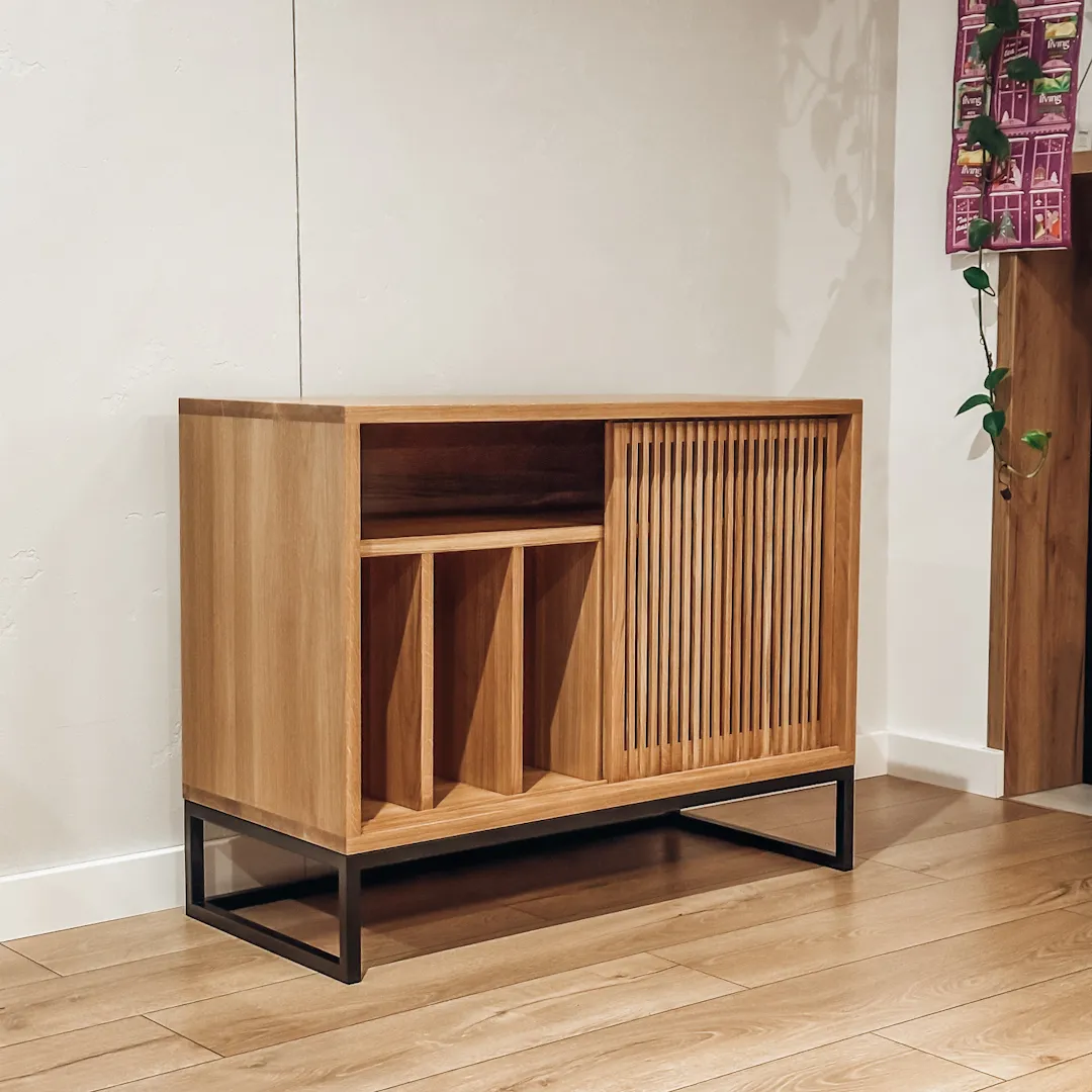 Drzwi od szafki możemy przesuwać, co zapewnia łatwy dostęp do wnętrza mebla. Dzięki temu możemy swobodnie przechowywać i organizować sprzęt audio oraz płyty winylowe. Brak tradycyjnych drzwiczek oszczędza również miejsce w pomieszczeniu.