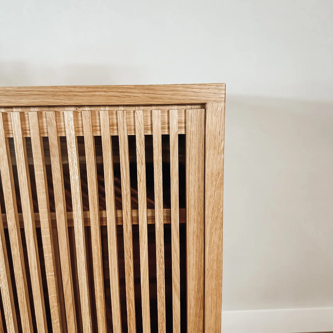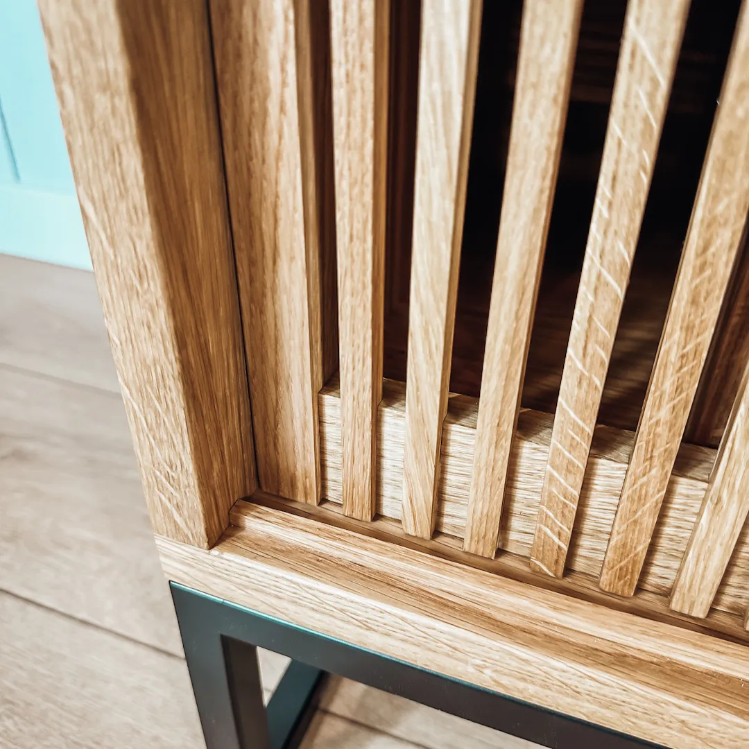 Projektując ten mebel, zadbaliśmy nie tylko o jej wygląd. Ażurowe drzwi są piękne, ale również bardzo praktyczne. Pełnią funkcję wentylacji, co jest bardzo istotne przy przechowywaniu urządzeń audio i płyt winylowych.  Odpowiednia cyrkulacja powietrza zapobiega nadmiernemu nagrzewaniu się sprzętu i przegrzaniu. W przypadku płyt winylowych, właściwa wentylacja chroni je przed wilgocią, która może uszkodzić delikatne rowki na powierzchni płyty, prowadząc do zniekształceń dźwięku. Dodatkowo dobra wentylacja minimalizuje ryzyko osadzania się kurzu, a to wpływa na jakość odtwarzania zarówno sprzętu, jak i płyt. Dzięki temu możesz być pewien, że Twoje ulubione nagrania pozostaną w doskonałym stanie przez lata.